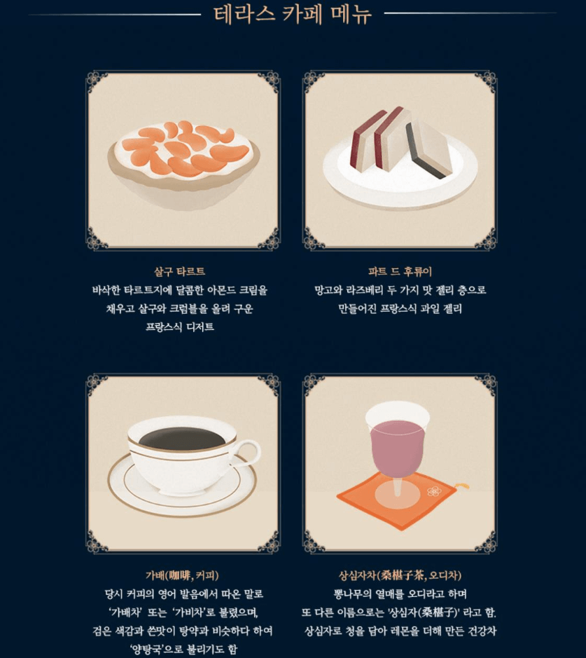 석조전 테라스에 특별한 공간을 마련하였습니다. 고종 황제가 즐겼던 가배(커피)와 디저트를 음미하며 석조전의 밤이 선사하는 맛과 멋을 즐겨보시기 바랍니다.